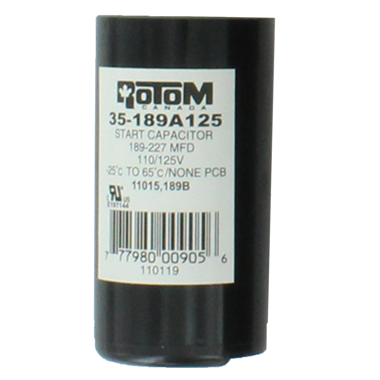 Heavy-duty motor start capacitor, 161–193 microfarads with 330 Volt AC rating for higher line voltage applications. Electrolytic design for intermittent duty on single-phase motors such as large compressors and pumps.